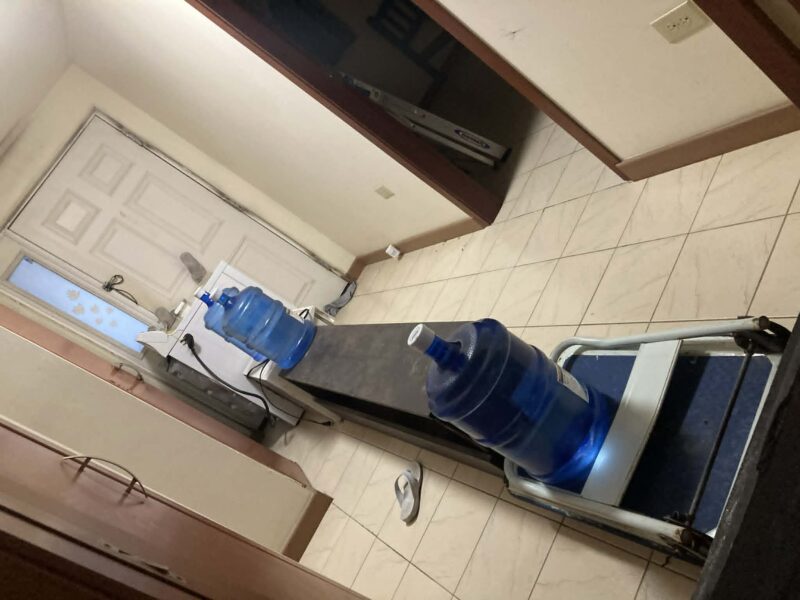 内開き玄関ドアを押さえる乾燥機・小型冷蔵庫も軋みます。